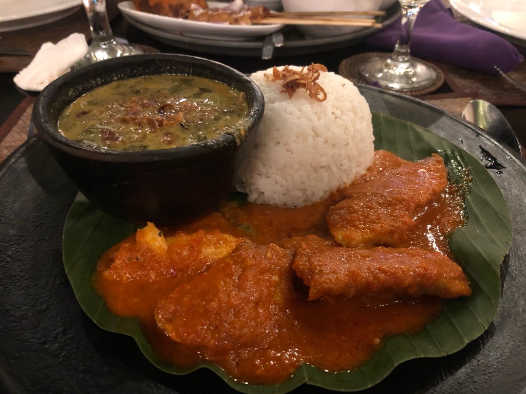 ‘s Avonds bij een restaurantje gaan eten, waar ik vis in pittige saus bestelde met gestoomde rijst en cassave bladeren.
